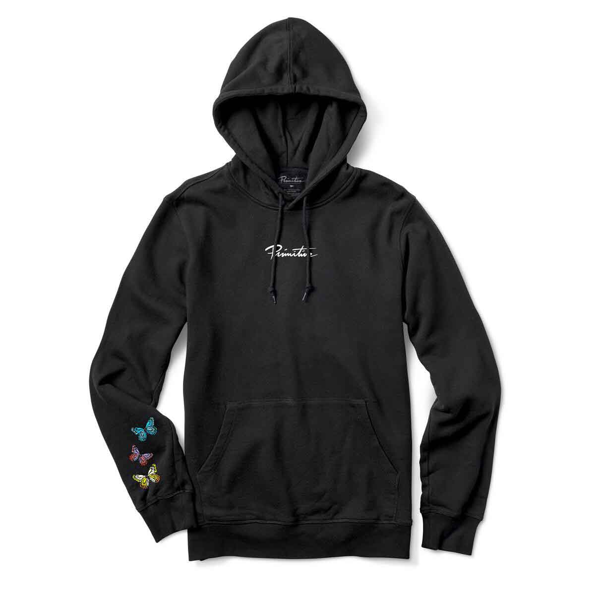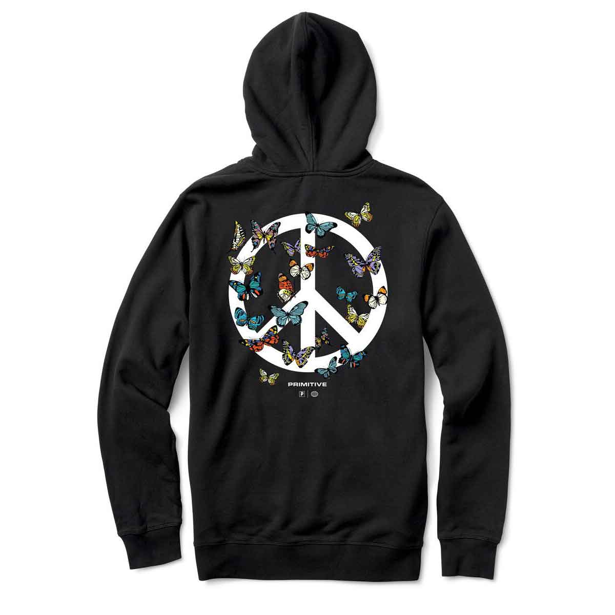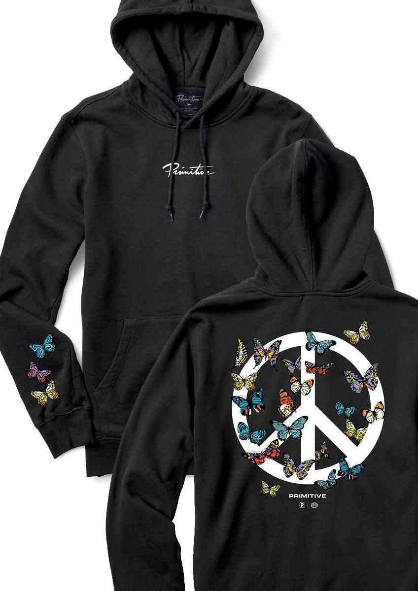 Primitive Nuevo Logo Druck vorne, Schmetterlinge am rechten Ärmel und großer Peace Logo Print mit Schmetterlingen am Rücken