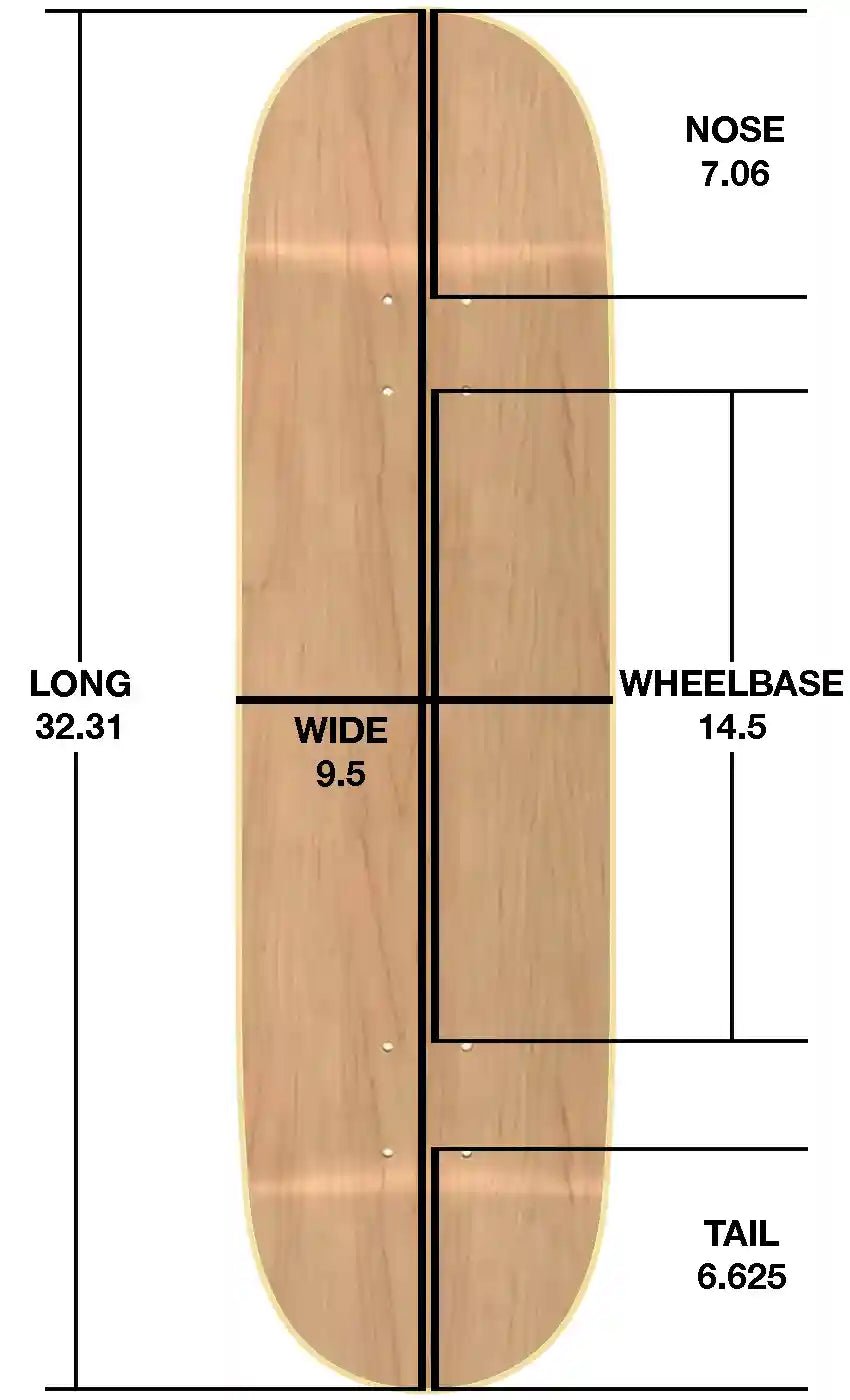9.5 Inch Breit, 32.31 Inch Lang, 14.5 Inch Wheelbase, 7.06 Inch Nose, 6.625 Inch Tail.