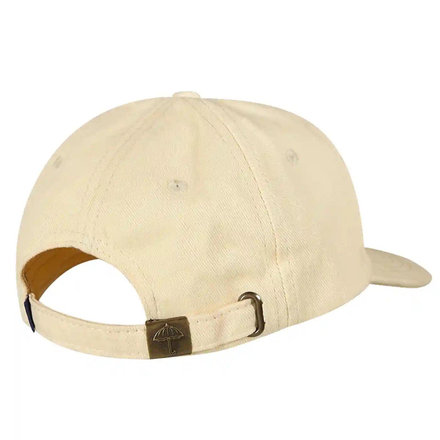 Size-adjustable strap back closure with Hélas Umbrella logo.