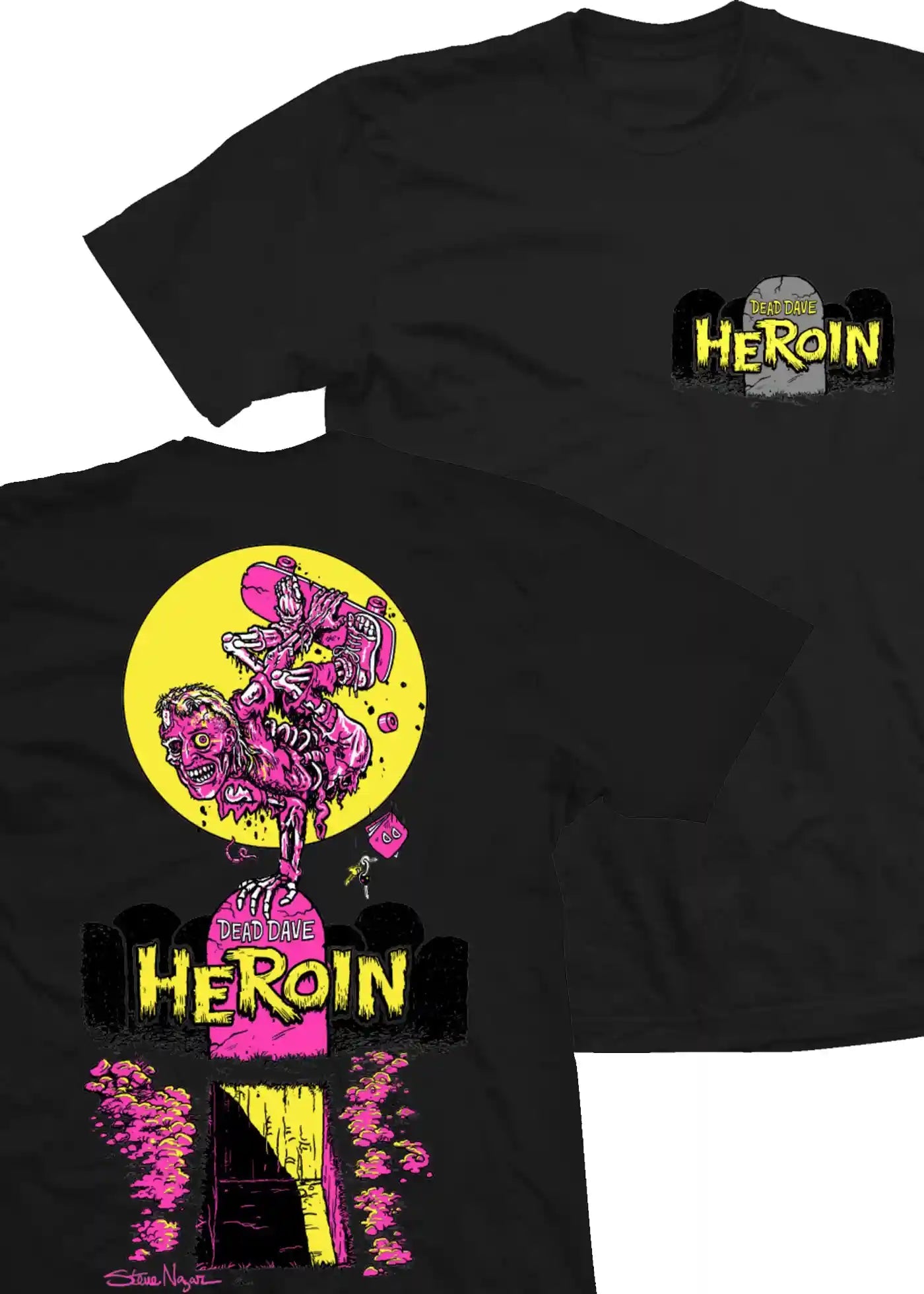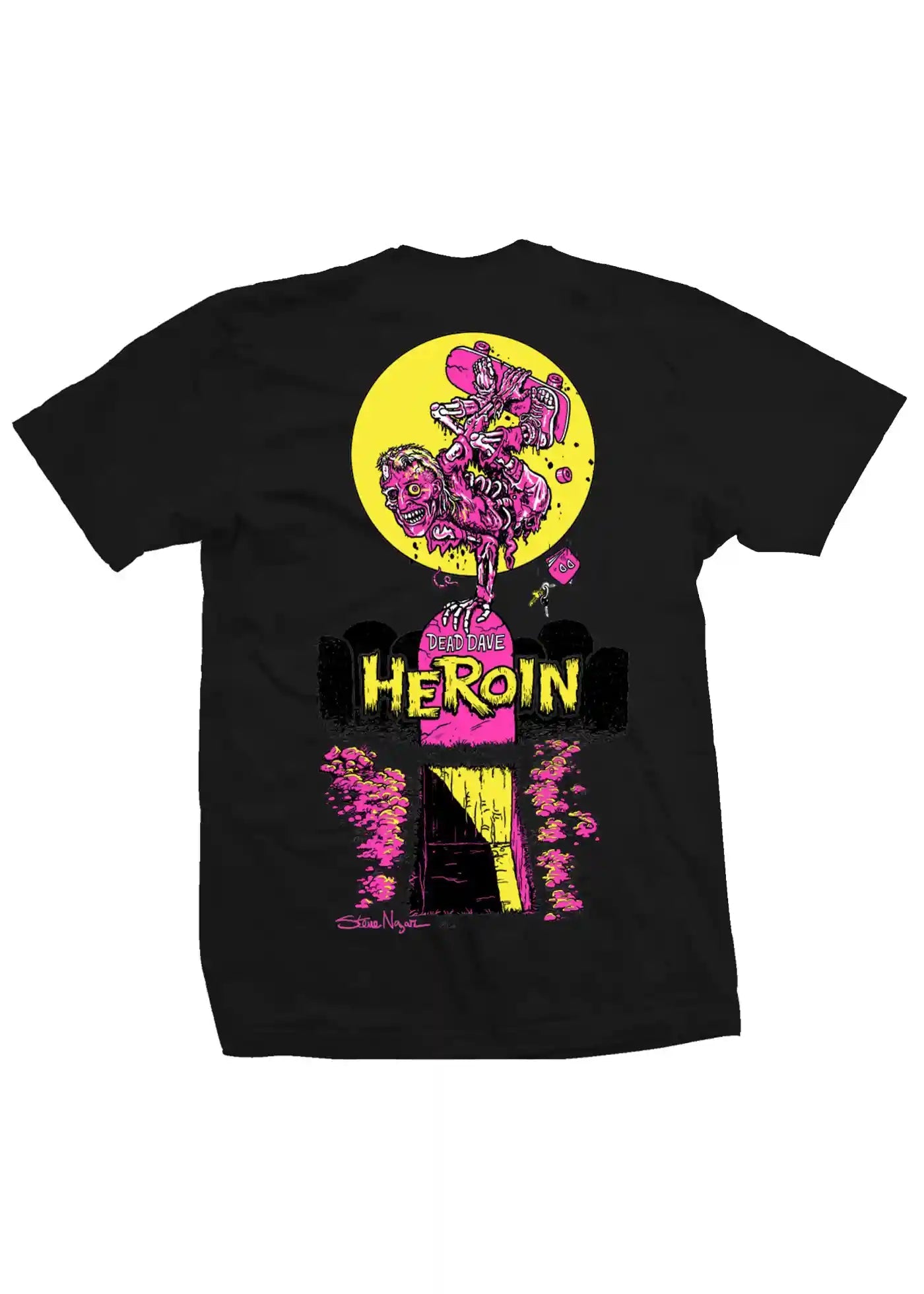 Heroin Skateboards logo print on front left chest, large zombie print on back.
