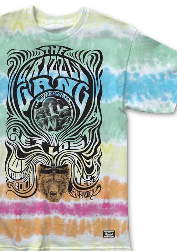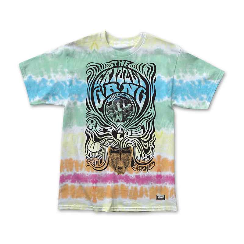 The Out Here est un t-shirt à manches courtes de Grizzly Griptape avec un lavage tie-dye et un grand imprimé Grizzly Gang sur le devant
