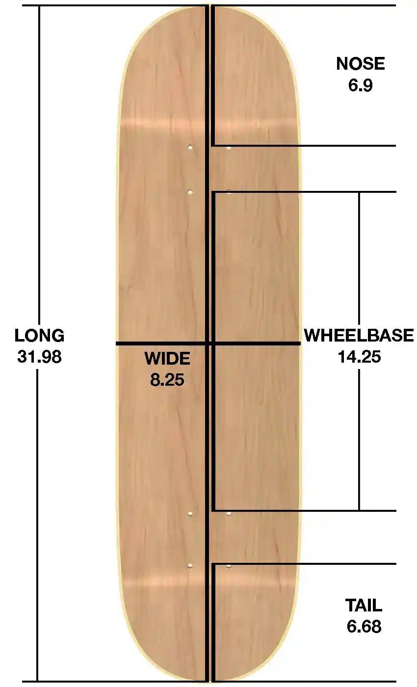 8.25 Inch Breit, 31.98 Inch Lang, 14.25 Inch Wheelbase, 6.9 Inch Nose, 6.68 Inch Tail.